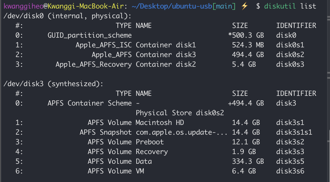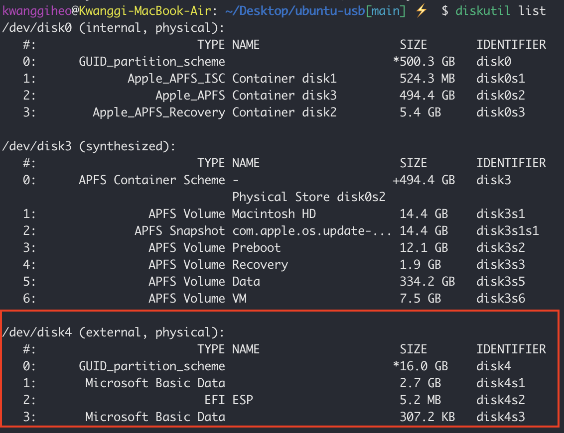 diskutil list를 해보면, usb disk의 파티션 구조가 바뀐 것을 보니 제대로 쓰기가 된 것 같습니다.