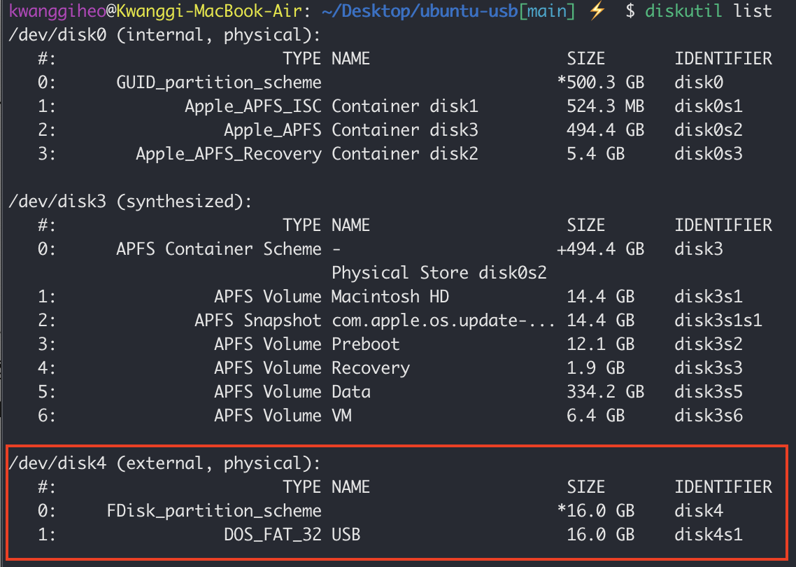 USB를 연결 후 다시 diskutil list를 확인합니다.