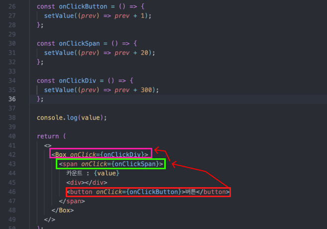 아래 코드를 보면 Box라는 div 아래 span, 그 아래로 button이 있는 계층 구조다.