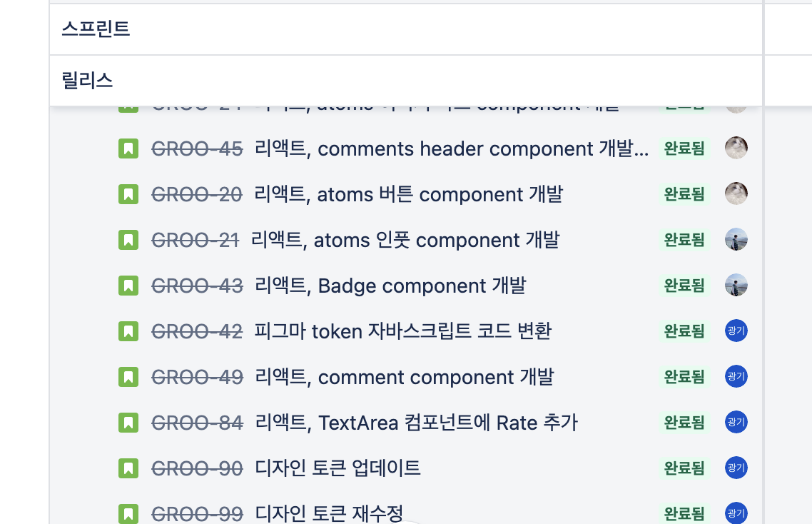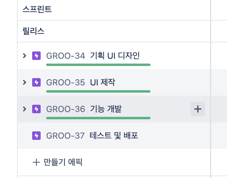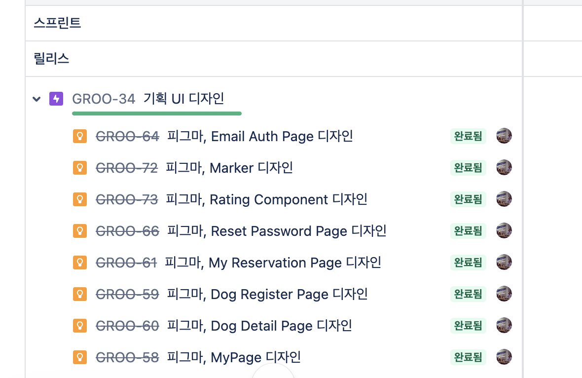 우리는 프로젝트 특성에 맞게 조금 변형했는데, Story 이슈를 생략하고 Epic을 일주일짜리 스프린트 목표로 설정했다. 아래와 같이 총 4개의 Epic으로 설정했다. 조금 의문이 들 수 있는 부분은 UI제작과 기능 개발을 나누었다는 점. 이유는 아토믹 패턴의 작은 단위인 button, Input, badge, textarea 부터 background, modal, loading 등을 미리 만들어두고 이후 페이지를 제작 때 기능과 함께 컴포넌트를 조합하는 방식을 채택했기 때문인데, 이 컴포넌트를 만드는 작업이 주요 작업이 될 것 같아서 Epic 단위로 설정했다.