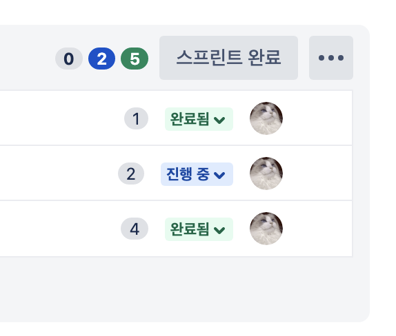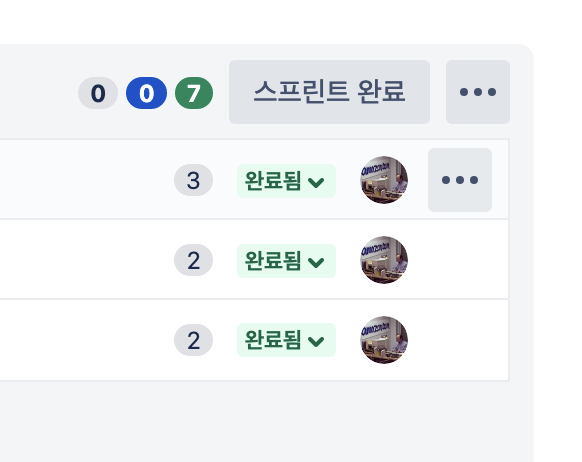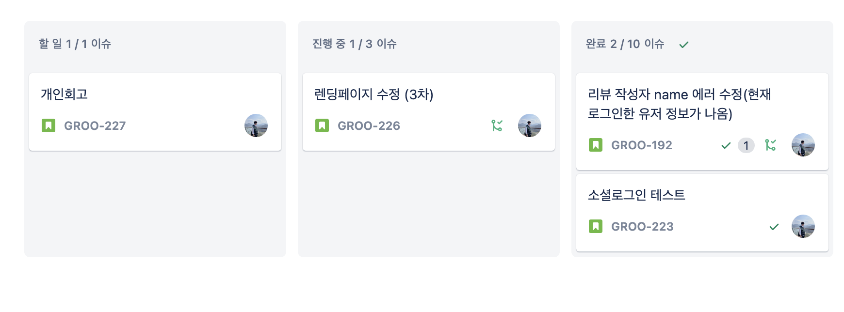 개인 이슈는 아래와 같이 할 일, 진행 중, 완료 3단계로 나누었다. 초반에는 pending도 만들어서 관리했었는데 pending으로 넘어가는 태스크가 우선순위에 자꾸 밀려나면서 루즈해질 때가 많아 pending은 삭제했다. 진행 중에도 두 가지 이상의 태스크가 쌓이지 않도록 권유했다.
