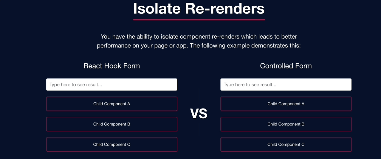 아래는 react hook form Docs에서 설명하는 예제인데, Controlled Form 방식과 React Hook Form 방식을 비교 테스트해볼 수 있다. react hook form만 해도 내용이 엄청 길어지기 때문에 이 부분은 여기서 생략하겠다.