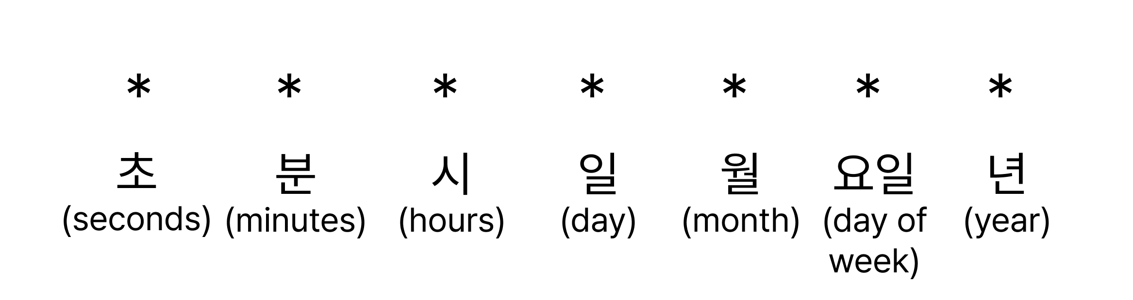 크론탭은 자바스크립트 정규표현식 처럼 시간을 조정할 수 있는 표현식이 있다. 총 7개 자릿수로 초, 분, 시, 일, 월, 요일, 년으로 이루어져 있다. 표현식을 정리해둔 블로그를 참고하면 좋다. 원하는 시간을 입력하면 표현식으로 바꿔주는 사이트도 있다.